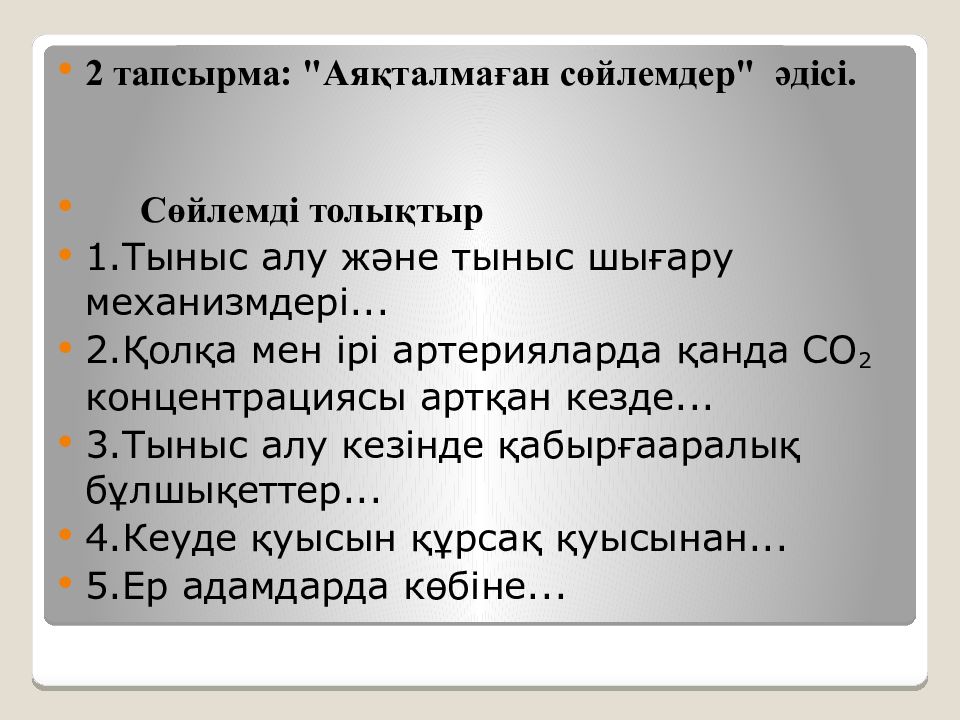 2 тапсырма: "Аяқталмаған сөйлемдер" әдісі. Сөйлемді толықтыр 1.Тыныс алу және тыныс шығару механизмдері... 2.Қолқа мен ірі артерияларда қанда СО 2 концентрациясы артқан кезде... 3.Тыныс алу кезінде қабырғааралық бұлшықеттер... 4.Кеуде қуысын құрсақ қуысынан... 5.Ер адамдарда көбіне...