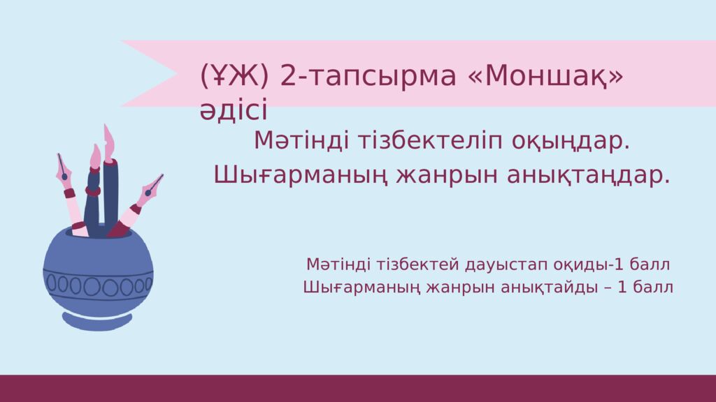 (ҰЖ) 2-тапсырма «Моншақ» әдісі Мәтінді тізбектеліп оқыңдар. Шығарманың жанрын анықтаңдар. Мәтінді тізбектей дауыстап оқиды-1 балл Шығарманың жанрын анықтайды – 1 балл