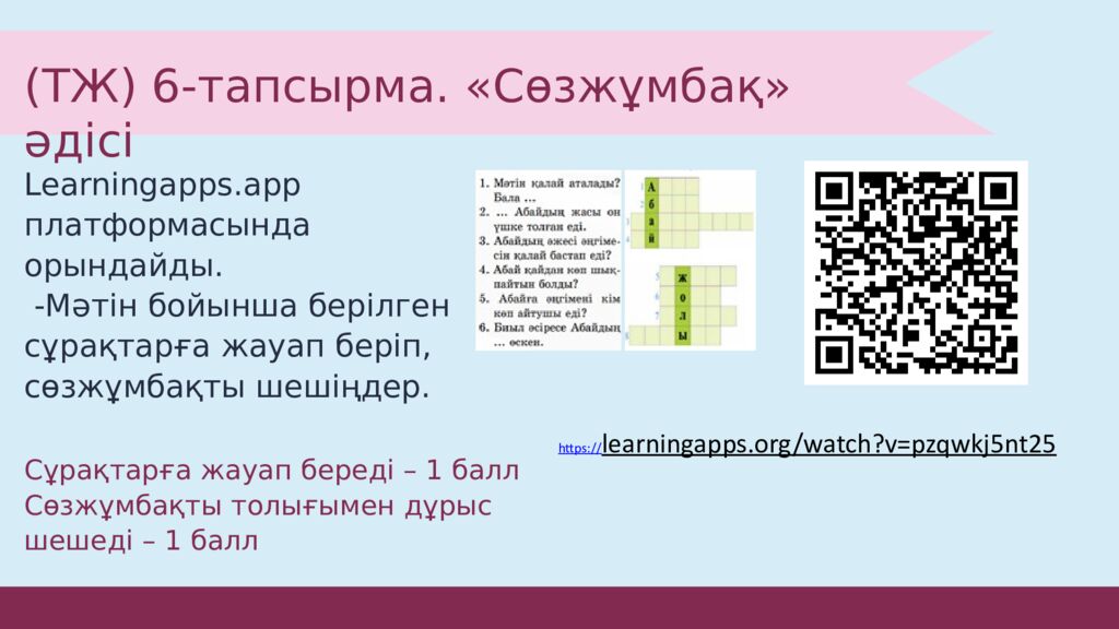 Learningapps.app платформасында орындайды. -Мәтін бойынша берілген сұрақтарға жауап беріп, сөзжұмбақты шешіңдер. (ТЖ) 6-тапсырма. « Сөзжұмбақ » әдісі Сұрақтарға жауап береді – 1 балл Сөзжұмбақты толығымен дұрыс шешеді – 1 балл https:// learningapps.org/watch?v=pzqwkj5nt25