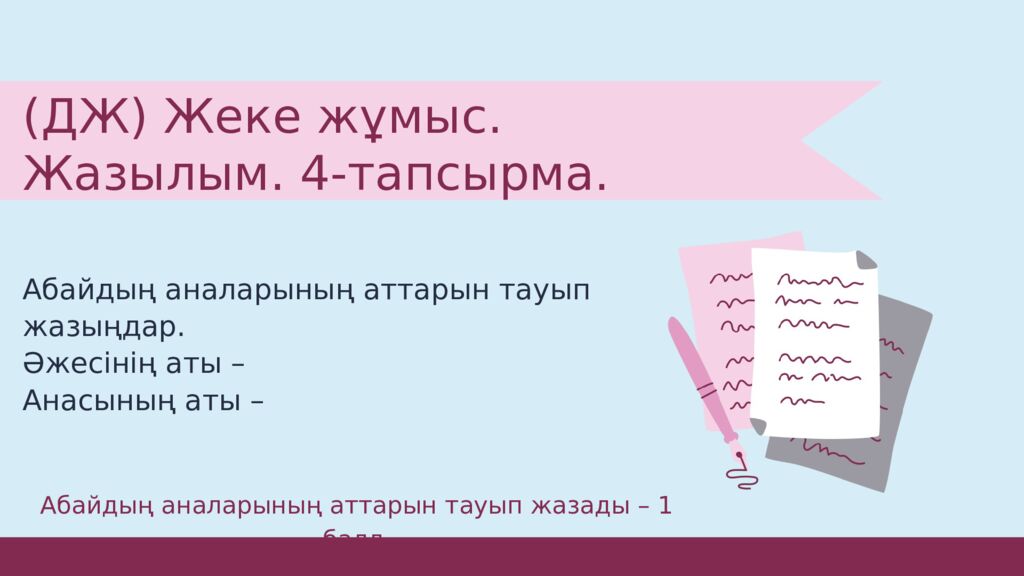 Абайдың аналарының аттарын тауып жазыңдар. Әжесінің аты – Анасының аты – (ДЖ) Жеке жұмыс. Жазылым. 4-тапсырма. Абайдың аналарының аттарын тауып жазады – 1 балл.