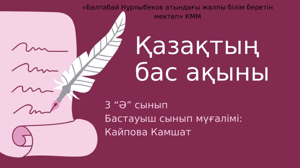 3 “Ә” сынып Бастауыш сынып мүғалімі: Кайпова Камшат Қазақтың бас ақыны «Балтабай Нұрлыбеков атындағы жалпы білім беретін мектеп» КММ