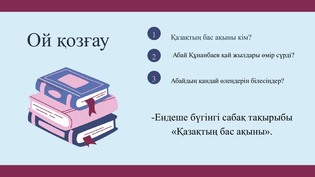 Қазақтың бас ақыны кім? 1 2 Абайдың қандай өлеңдерін білесіңдер ? 3 Ой қозғау Абай Құнанбаев қай жылдары өмір сүрді ? -Ендеше бүгінгі сабақ тақырыбы «Қазақтың бас ақыны».