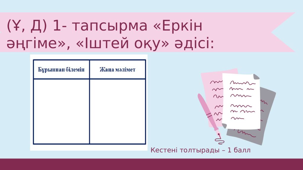 (Ұ, Д) 1- тапсырма «Еркін әңгіме», «Іштей оқу» әдісі: Кестені толтырады – 1 балл