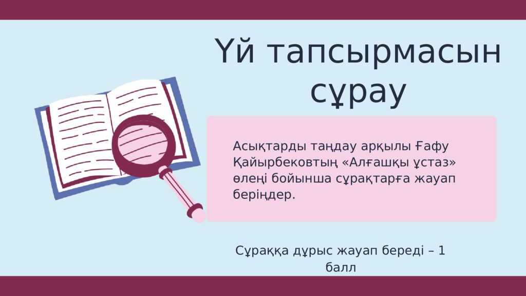 Үй тапсырмасын сұрау Асықтарды таңдау арқылы Ғафу Қайырбековтың «Алғашқы ұстаз» өлеңі бойынша сұрақтарға жауап беріңдер. Сұраққа дұрыс жауап береді – 1 балл