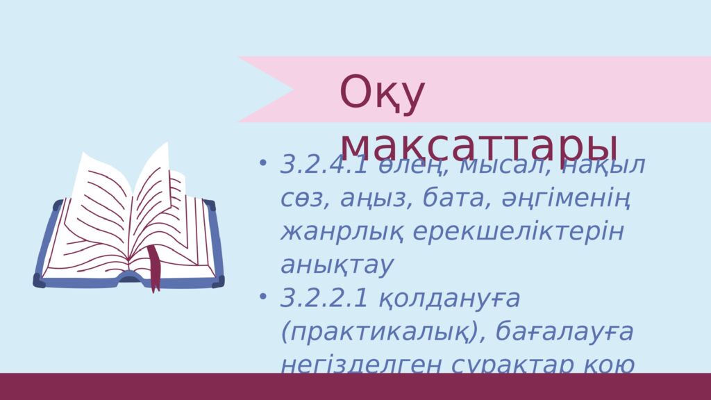 Оқу мақсаттары 3.2.4.1 өлең, мысал, нақыл сөз, аңыз, бата, әңгіменің жанрлық ерекшеліктерін анықтау 3.2.2.1 қолдануға (практикалық), бағалауға негізделген сұрақтар қою және жауап беру.