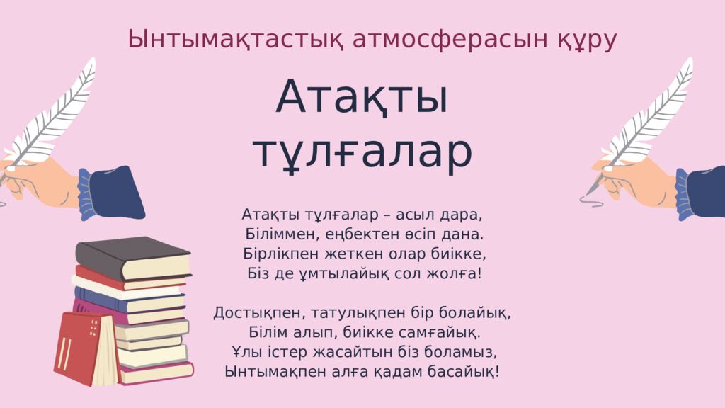 Атақты тұлғалар – асыл дара, Біліммен, еңбектен өсіп дана. Бірлікпен жеткен олар биікке, Біз де ұмтылайық сол жолға! Достықпен, татулықпен бір болайық, Білім алып, биікке самғайық. Ұлы істер жасайтын біз боламыз, Ынтымақпен алға қадам басайық! Атақты тұлғалар Ынтымақтастық атмосферасын құру