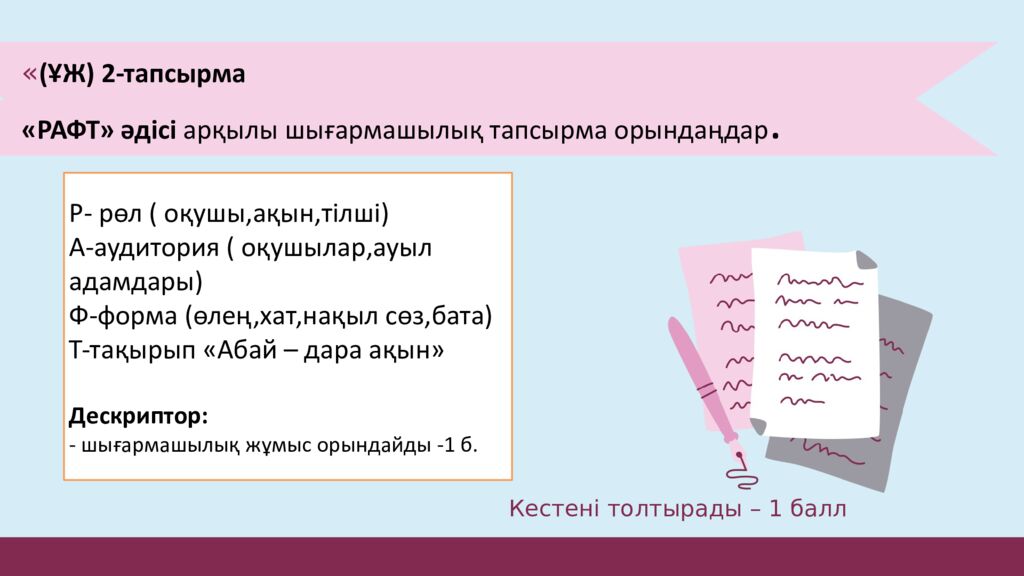 « (ҰЖ) 2-тапсырма «РАФТ» әдісі арқылы шығармашылық тапсырма орындаңдар. Кестені толтырады – 1 балл Р- рөл ( оқушы,ақын,тілші) А-аудитория ( оқушылар,ауыл адамдары ) Ф-форма (өлең,хат,нақыл сөз,бата) Т-тақырып «Абай – дара ақын» Дескриптор : - шығармашылық жұмыс орындайды -1 б.