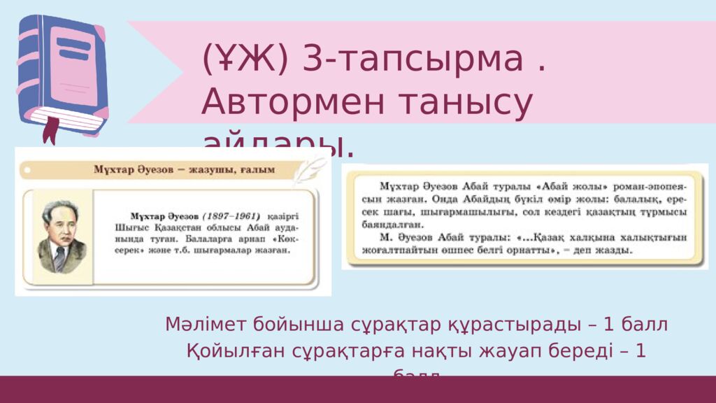 (ҰЖ) 3-тапсырма. Автормен танысу айдары. Мәлімет бойынша сұрақтар құрастырады – 1 балл Қойылған сұрақтарға нақты жауап береді – 1 балл