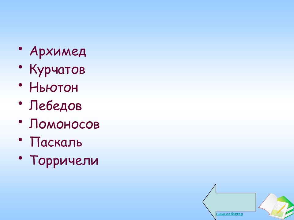 Архимед Курчатов Лобачевский Ньютон Лебедев Ломоносов Паскаль Торричелли