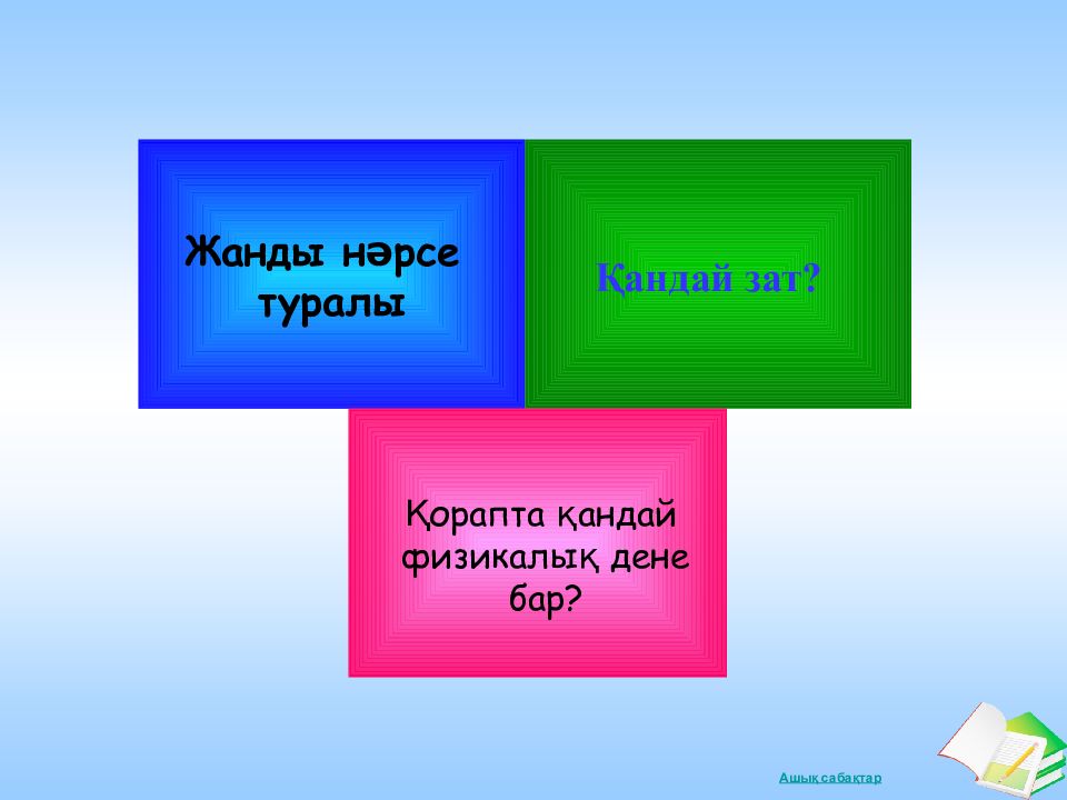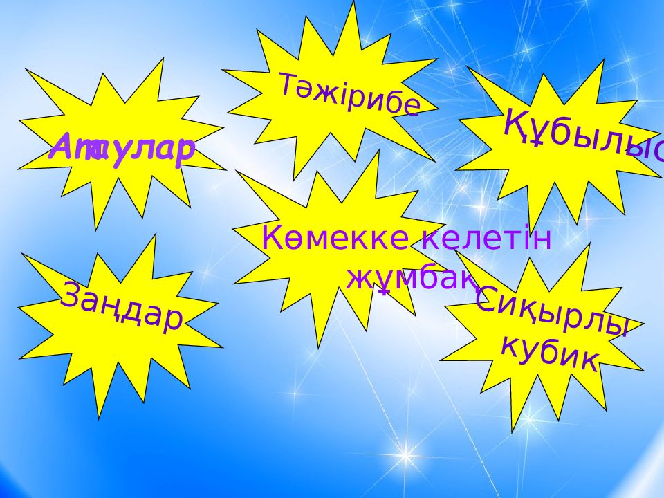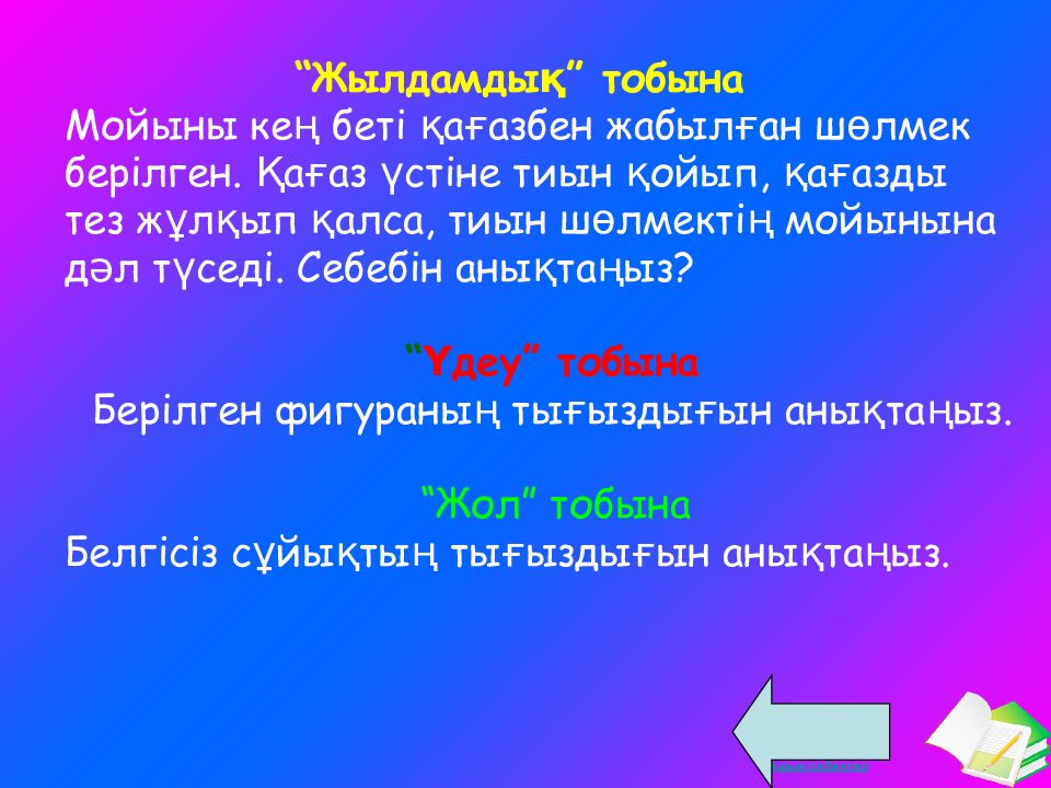 “Жылдамдық” тобына Мойыны кең беті қағазбен жабылған шөлмек берілген. Қағаз үстіне тиын қойып, қағазды тез жұлқып қалса, тиын шөлмектің мойынына дәл түседі. Себебін анықтаңыз? “ Үдеу” тобына Берілген фигураның тығыздығын анықтаңыз. “Жол” тобына Белгісіз сұйықтың тығыздығын анықтаңыз.