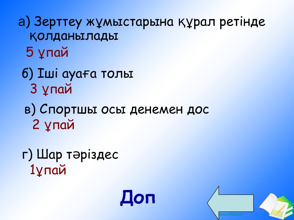 а ) Зерттеу жұмыстарына құрал ретінде қолданылады 5 ұпай б) Іші ауаға толы 3 ұпай в) Спортшы осы денемен дос 2 ұпай г) Шар тәріздес 1ұпай Доп