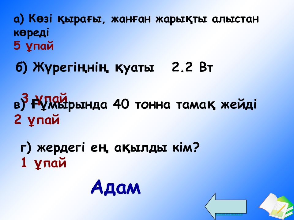 б) Жүрегіңнің қуаты 2.2 Вт 3 ұпай в) Ғұмырында 40 тонна тамақ жейді 2 ұпай г) жердегі ең ақылды кім? 1 ұпай Адам