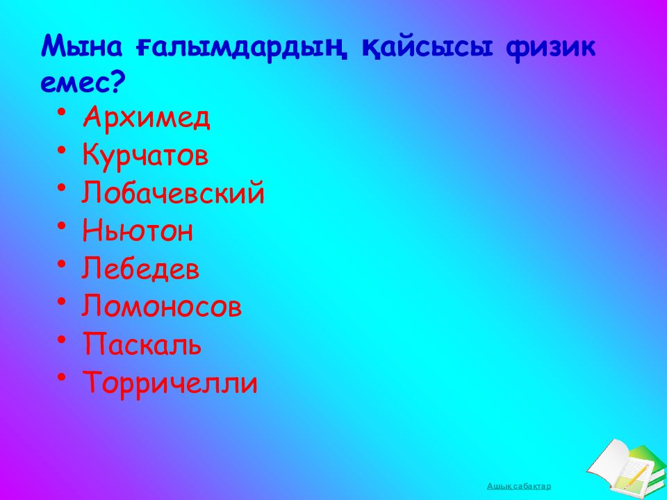 Слайд 12: Мына ғалымдардың қайсысы физик емес?