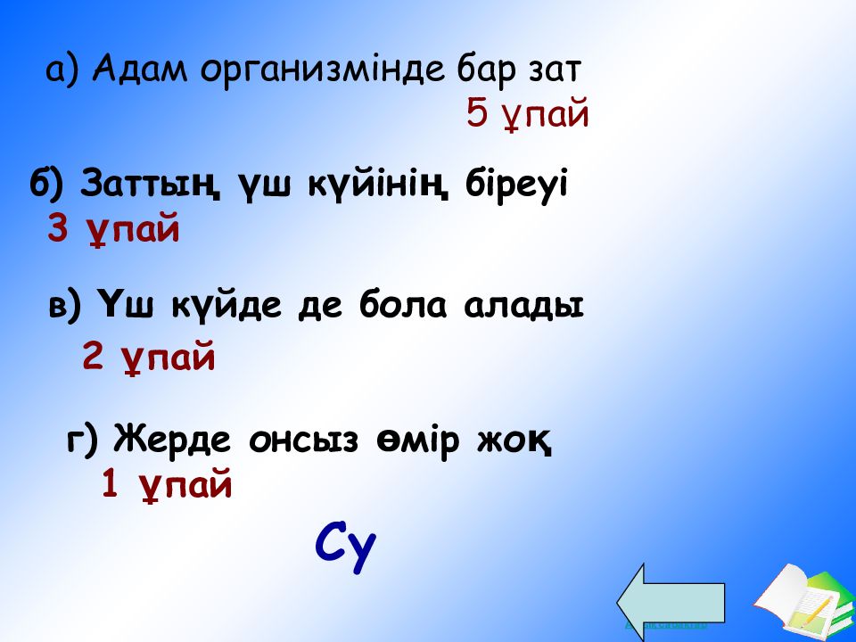 а) Адам организмінде бар зат 5 ұпай б) Заттың үш күйінің біреуі 3 ұпай в) Үш күйде де бола алады 2 ұпай г) Жерде онсыз өмір жоқ 1 ұпай Су