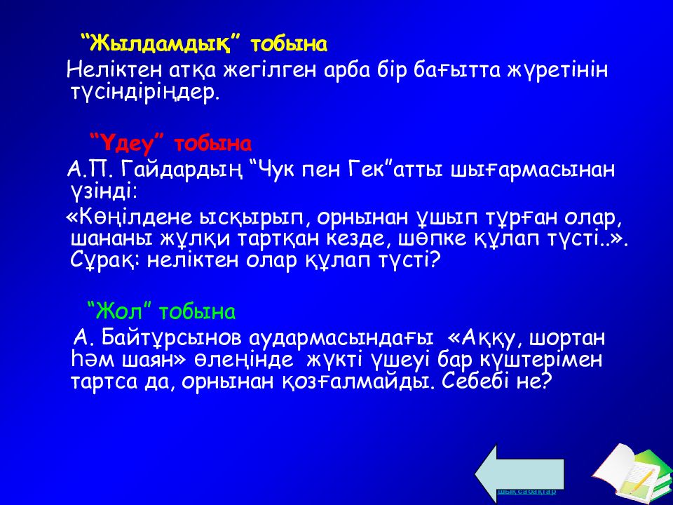 “Жылдамдық” тобына Неліктен атқа жегілген арба бір бағытта жүретінін түсіндіріңдер. “Үдеу” тобына А.П. Гайдардың “Чук пен Гек”атты шығармасынан үзінді : «Көңілдене ысқырып, орнынан ұшып тұрған олар, шананы жұлқи тартқан кезде, шөпке құлап түсті..». Сұрақ: неліктен олар құлап түсті? “Жол” тобына А. Байтұрсынов аудармасындағы «Аққу, шортан һәм шаян» өлеңінде жүкті үшеуі бар күштерімен тартса да, орнынан қозғалмайды. Себебі не?
