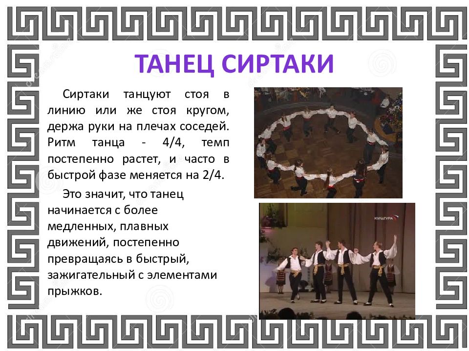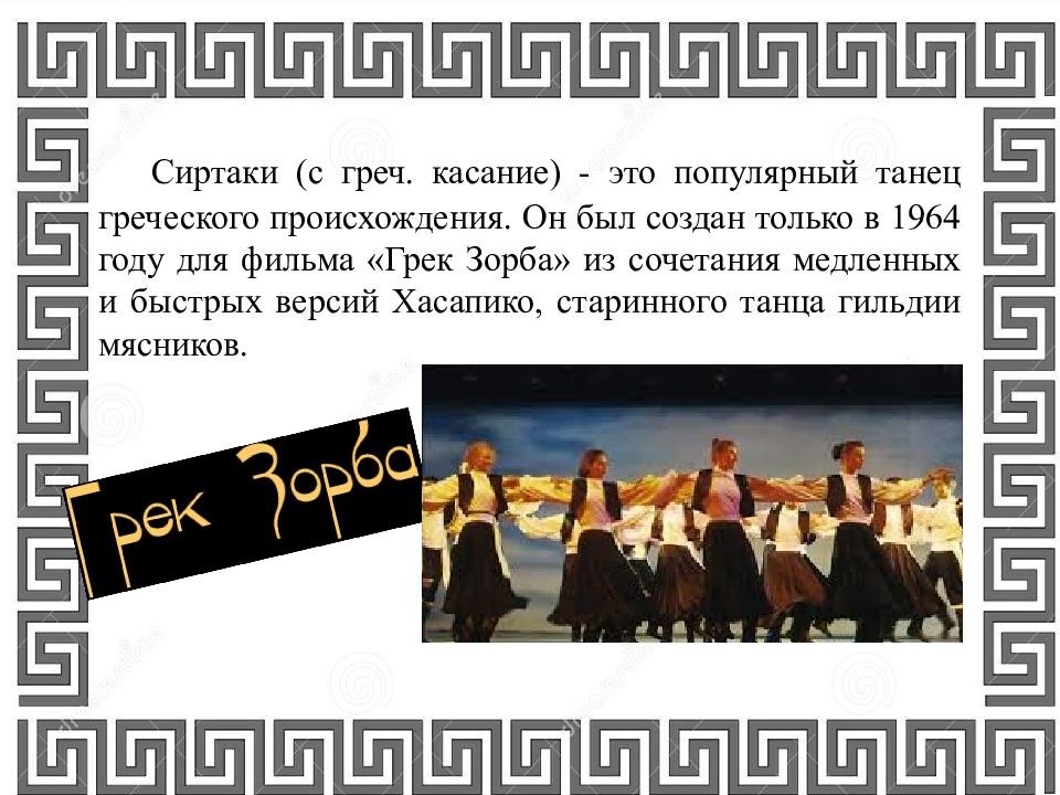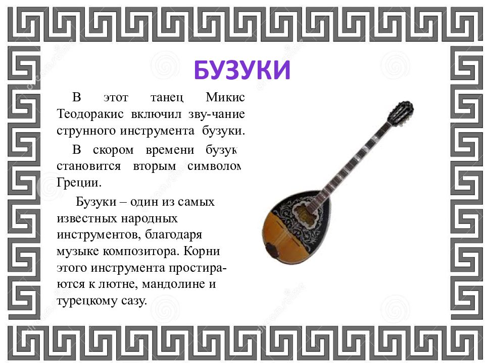 В этот танец Микис Теодоракис включил зву-чание струнного инструмента бузуки. В скором времени бузуки становится вторым символом Греции. Бузуки – один из самых известных народных инструментов, благодаря музыке композитора. Корни этого инструмента простира-ются к лютне, мандолине и турецкому сазу.