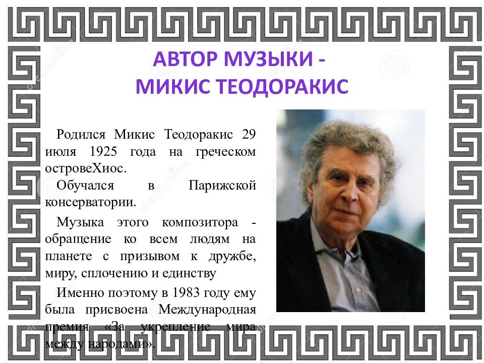 Родился Микис Теодоракис 29 июля 1925 года на греческом островеХиос. Обучался в Парижской консерватории. Музыка этого композитора - обращение ко всем людям на планете с призывом к дружбе, миру, сплочению и единству Именно поэтому в 1983 году ему была присвоена Международная премия «За укрепление мира между народами».