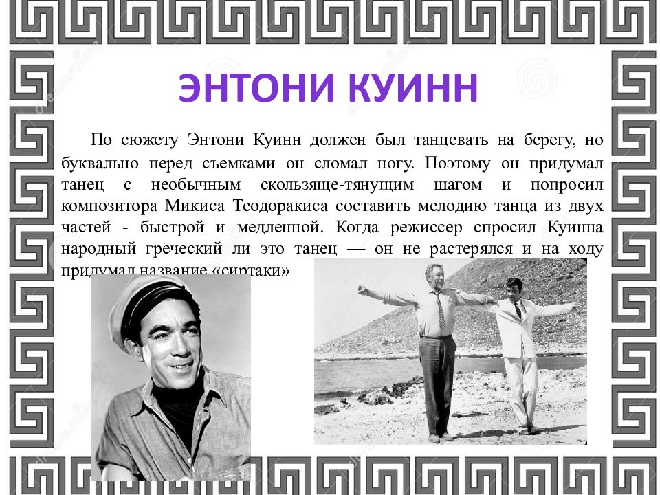 По сюжету Энтони Куинн должен был танцевать на берегу, но буквально перед съемками он сломал ногу. Поэтому он придумал танец с необычным скользяще-тянущим шагом и попросил композитора Микиса Теодоракиса составить мелодию танца из двух частей - быстрой и медленной. Когда режиссер спросил Куинна народный греческий ли это танец — он не растерялся и на ходу придумал название «сиртаки »