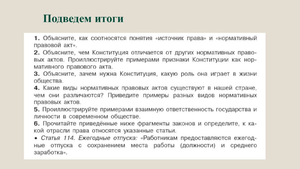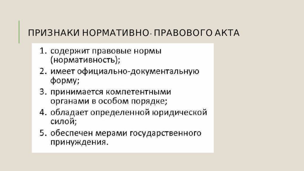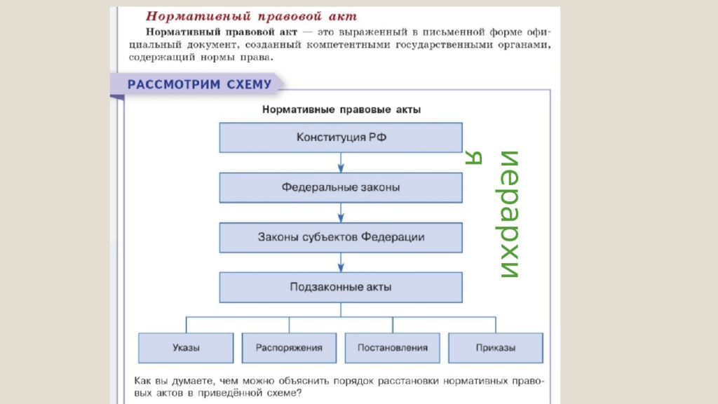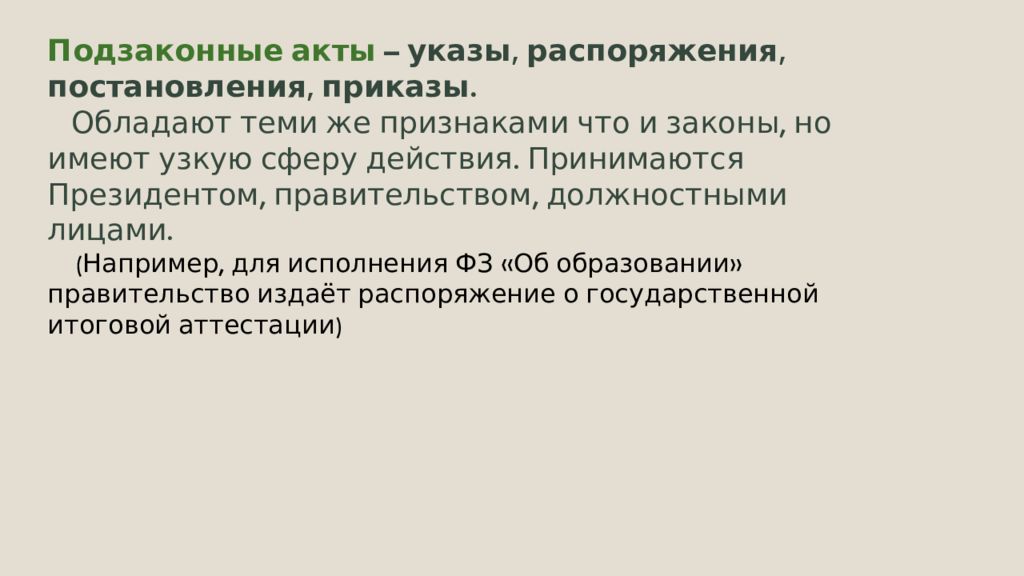Подзаконные акты – указы, распоряжения, постановления, приказы. Обладают теми же признаками что и законы, но имеют узкую сферу действия. Принимаются Президентом, правительством, должностными лицами. (Например, для исполнения ФЗ «Об образовании» правительство издаёт распоряжение о государственной итоговой аттестации)