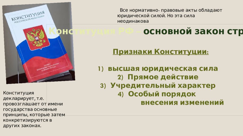 Все нормативно- правовые акты обладают юридической силой. Но эта сила неодинакова Конституция РФ – основной закон страны. Признаки Конституции: высшая юридическая сила Прямое действие Учредительный характер Особый порядок внесения изменений Конституция декларирует, т.е. провозглашает от имени государства основные принципы, которые затем конкретизируются в других законах.