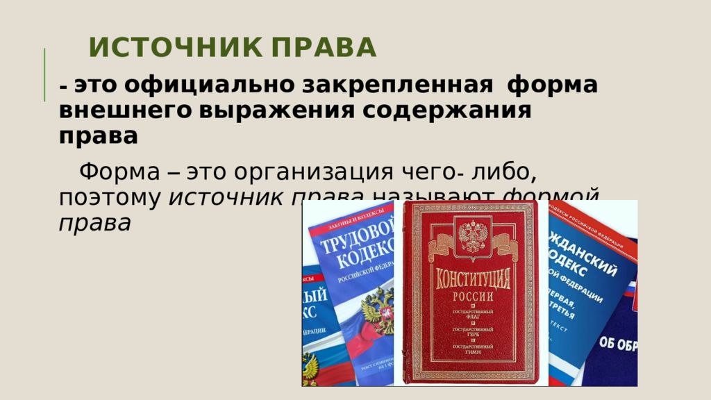 - это официально закрепленная форма внешнего выражения содержания права Форма – это организация чего- либо, поэтому источник права называют формой права