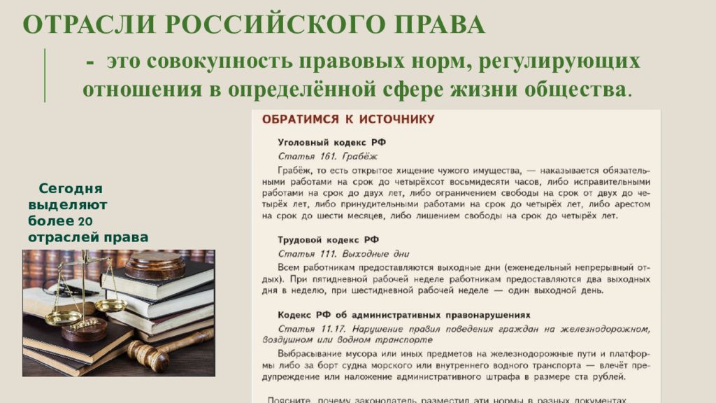 - это совокупность правовых норм, регулирующих отношения в определённой сфере жизни общества. Сегодня выделяют более 20 отраслей права