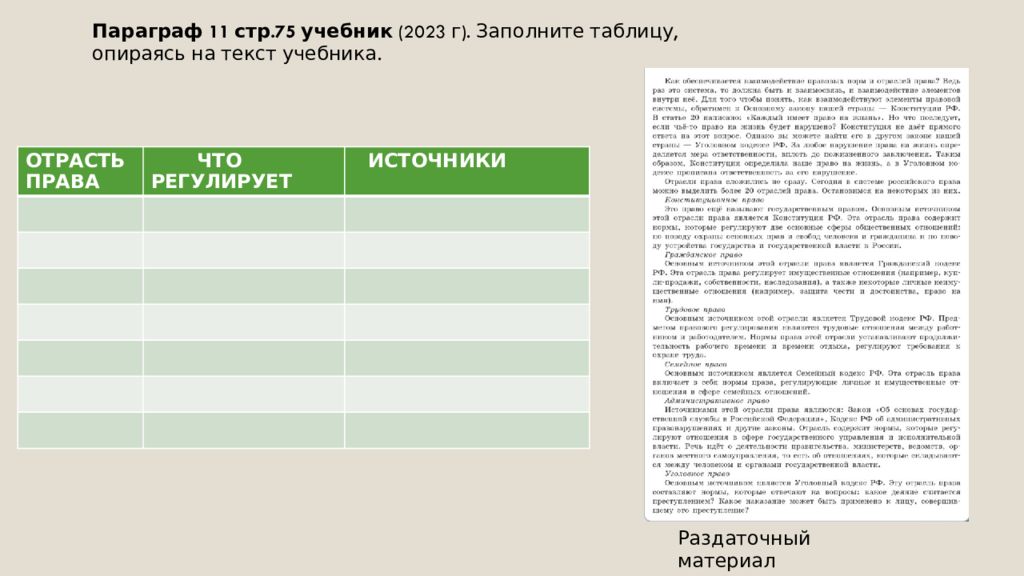 ОТРАСТЬ ПРАВА ЧТО РЕГУЛИРУЕТ ИСТОЧНИКИ Параграф 11 стр.75 учебник (2023 г). Заполните таблицу, опираясь на текст учебника. Раздаточный материал