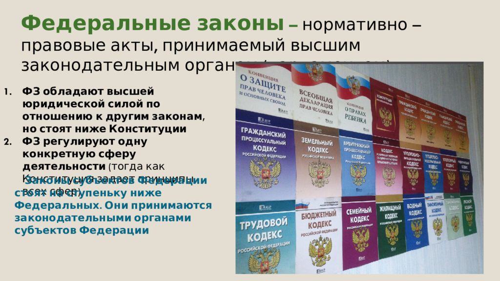Федеральные законы – нормативно – правовые акты, принимаемый высшим законодательным органом (парламентом) ФЗ обладают высшей юридической силой по отношению к другим законам, но стоят ниже Конституции ФЗ регулируют одну конкретную сферу деятельности (тогда как Конституция задает принципы всех сфер) Законы субъектов Федерации стоят на ступеньку ниже Федеральных. Они принимаются законодательными органами субъектов Федерации