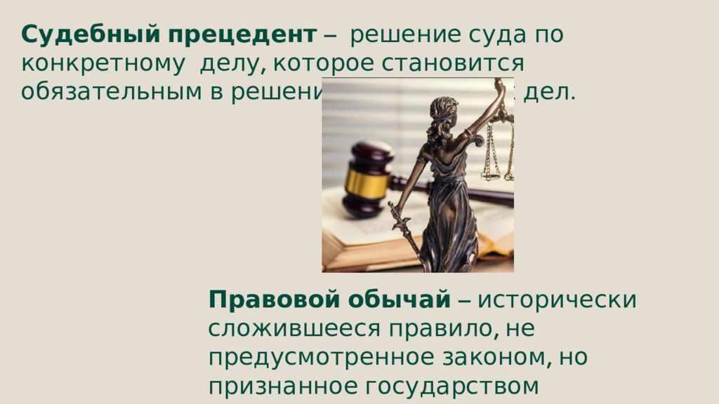 Судебный прецедент – решение суда по конкретному делу, которое становится обязательным в решении аналогичных дел. Правовой обычай – исторически сложившееся правило, не предусмотренное законом, но признанное государством