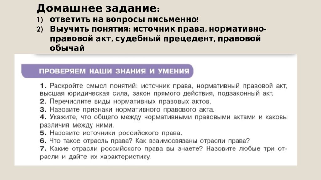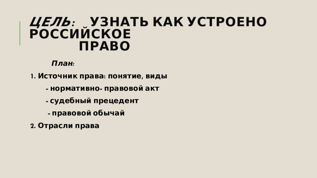 План: 1. Источник права: понятие, виды - нормативно- правовой акт - судебный прецедент - правовой обычай 2. Отрасли права
