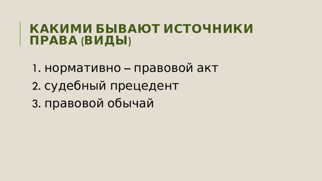 1. нормативно – правовой акт 2. судебный прецедент 3. правовой обычай