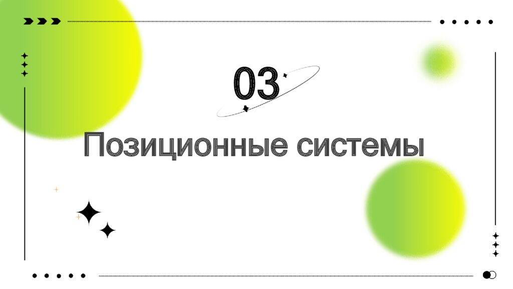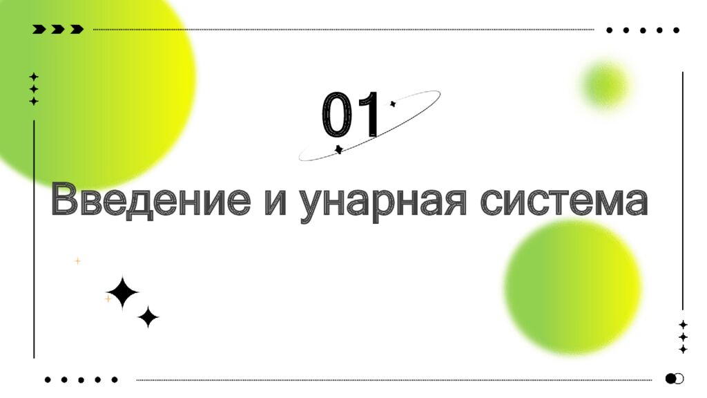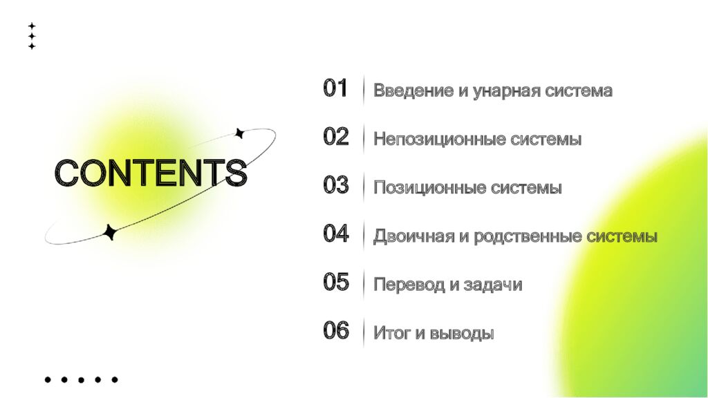 01 Введение и унарная система 02 Непозиционные системы 03 Позиционные системы 04 Двоичная и родственные системы 05 Перевод и задачи 06 Итог и выводы CONTENTS