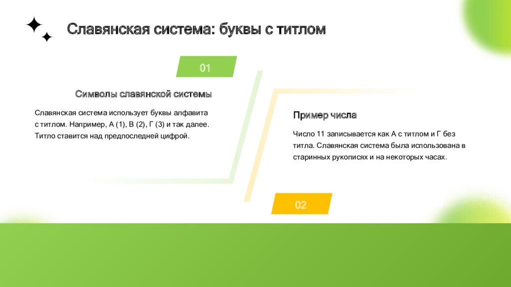 02 01 Символы славянской системы Славянская система использует буквы алфавита с титлом. Например, А (1), В (2), Г (3) и так далее. Титло ставится над предпоследней цифрой. Пример числа Число 11 записывается как А с титлом и Г без титла. Славянская система была использована в старинных рукописях и на некоторых часах. Славянская система: буквы с титлом