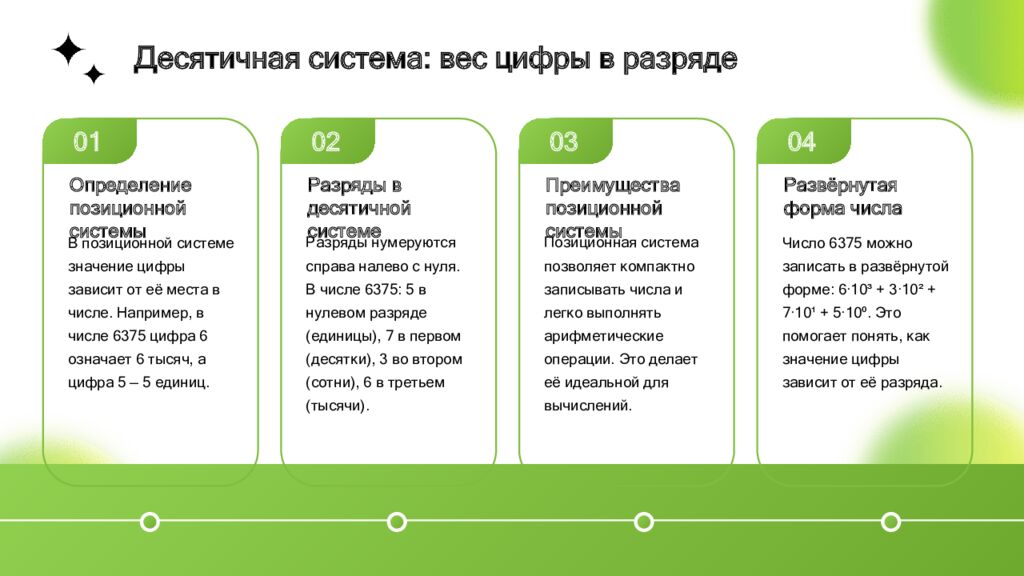 Определение позиционной системы В позиционной системе значение цифры зависит от её места в числе. Например, в числе 6375 цифра 6 означает 6 тысяч, а цифра 5 — 5 единиц. 01 Разряды в десятичной системе Разряды нумеруются справа налево с нуля. В числе 6375: 5 в нулевом разряде (единицы), 7 в первом (десятки), 3 во втором (сотни), 6 в третьем (тысячи). 02 Преимущества позиционной системы Позиционная система позволяет компактно записывать числа и легко выполнять арифметические операции. Это делает её идеальной для вычислений. 03 Развёрнутая форма числа Число 6375 можно записать в развёрнутой форме: 6·10³ + 3·10² + 7·10¹ + 5·10⁰. Это помогает понять, как значение цифры зависит от её разряда. 04 Десятичная система: вес цифры в разряде