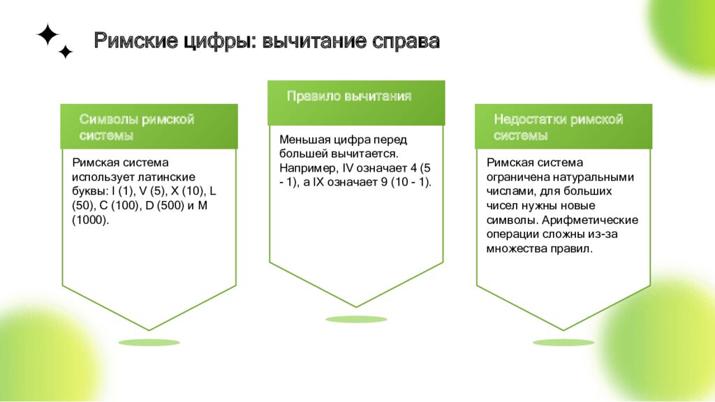 Символы римской системы Римская система использует латинские буквы: I (1), V (5), X (10), L (50), C (100), D (500) и M (1000). Правило вычитания Меньшая цифра перед большей вычитается. Например, IV означает 4 (5 - 1), а IX означает 9 (10 - 1). Недостатки римской системы Римская система ограничена натуральными числами, для больших чисел нужны новые символы. Арифметические операции сложны из-за множества правил. Римские цифры: вычитание справа