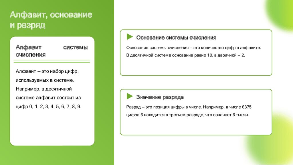 Алфавит, основание и разряд Алфавит системы счисления Алфавит — это набор цифр, используемых в системе. Например, в десятичной системе алфавит состоит из цифр 0, 1, 2, 3, 4, 5, 6, 7, 8, 9. Основание системы счисления Основание системы счисления — это количество цифр в алфавите. В десятичной системе основание равно 10, в двоичной — 2. Значение разряда Разряд — это позиция цифры в числе. Например, в числе 6375 цифра 6 находится в третьем разряде, что означает 6 тысяч.