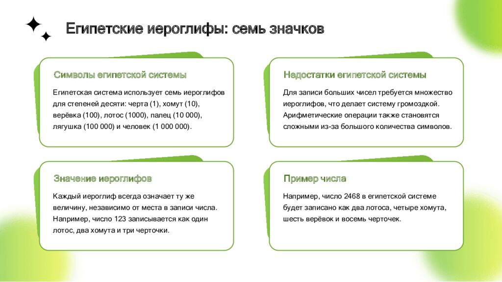 Символы египетской системы Египетская система использует семь иероглифов для степеней десяти: черта (1), хомут (10), верёвка (100), лотос (1000), палец (10 000), лягушка (100 000) и человек (1 000 000). Недостатки египетской системы Для записи больших чисел требуется множество иероглифов, что делает систему громоздкой. Арифметические операции также становятся сложными из-за большого количества символов. Значение иероглифов Каждый иероглиф всегда означает ту же величину, независимо от места в записи числа. Например, число 123 записывается как один лотос, два хомута и три черточки. Пример числа Например, число 2468 в египетской системе будет записано как два лотоса, четыре хомута, шесть верёвок и восемь черточек. Египетские иероглифы: семь значков
