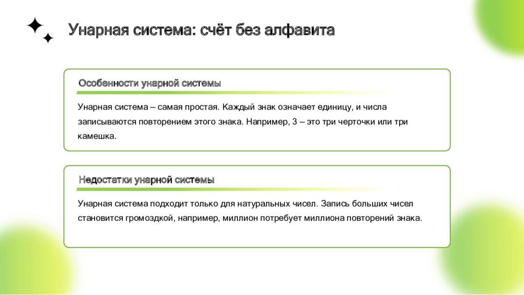 Особенности унарной системы Унарная система — самая простая. Каждый знак означает единицу, и числа записываются повторением этого знака. Например, 3 — это три черточки или три камешка. Недостатки унарной системы Унарная система подходит только для натуральных чисел. Запись больших чисел становится громоздкой, например, миллион потребует миллиона повторений знака. Унарная система: счёт без алфавита