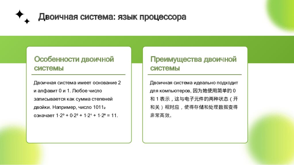 Особенности двоичной системы Двоичная система имеет основание 2 и алфавит 0 и 1. Любое число записывается как сумма степеней двойки. Например, число 1011₂ означает 1·2³ + 0·2² + 1·2¹ + 1·2⁰ = 11. Преимущества двоичной системы Двоичная система идеально подходит для компьютеров,因为她使用简单的0和1表示,这与电子元件的两种状态(开和关)相对应,使得存储和处理数据变得非常高效。 Двоичная система: язык процессора