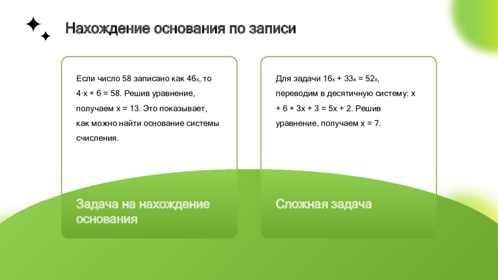 Для задачи 16ₓ + 33ₓ = 52ₓ, переводим в десятичную систему: x + 6 + 3x + 3 = 5x + 2. Решив уравнение, получаем x = 7. Сложная задача Если число 58 записано как 46ₓ, то 4·x + 6 = 58. Решив уравнение, получаем x = 13. Это показывает, как можно найти основание системы счисления. Задача на нахождение основания Нахождение основания по записи