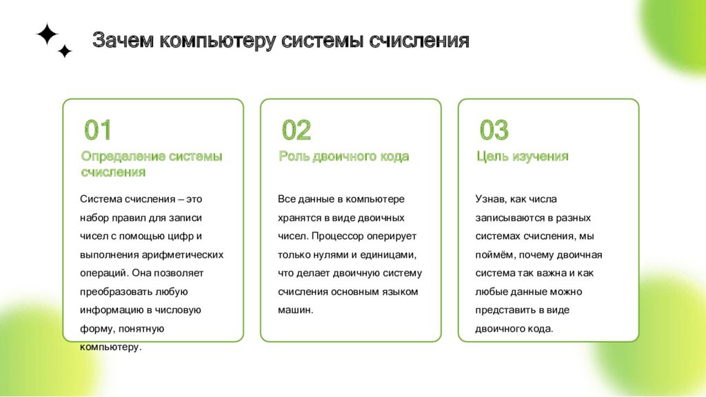 Определение системы счисления Система счисления — это набор правил для записи чисел с помощью цифр и выполнения арифметических операций. Она позволяет преобразовать любую информацию в числовую форму, понятную компьютеру. 01 Роль двоичного кода Все данные в компьютере хранятся в виде двоичных чисел. Процессор оперирует только нулями и единицами, что делает двоичную систему счисления основным языком машин. 02 Цель изучения Узнав, как числа записываются в разных системах счисления, мы поймём, почему двоичная система так важна и как любые данные можно представить в виде двоичного кода. 03 Зачем компьютеру системы счисления