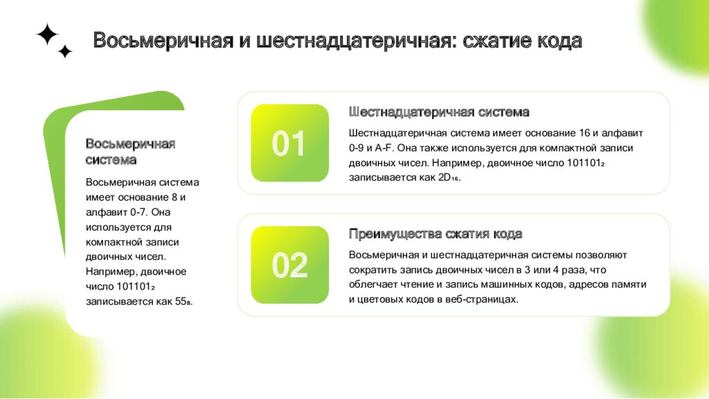 Шестнадцатеричная система Шестнадцатеричная система имеет основание 16 и алфавит 0-9 и A-F. Она также используется для компактной записи двоичных чисел. Например, двоичное число 101101₂ записывается как 2D₁₆. 01 Восьмеричная система Восьмеричная система имеет основание 8 и алфавит 0-7. Она используется для компактной записи двоичных чисел. Например, двоичное число 101101₂ записывается как 55₈. Преимущества сжатия кода Восьмеричная и шестнадцатеричная системы позволяют сократить запись двоичных чисел в 3 или 4 раза, что облегчает чтение и запись машинных кодов, адресов памяти и цветовых кодов в веб-страницах. 02 Восьмеричная и шестнадцатеричная: сжатие кода