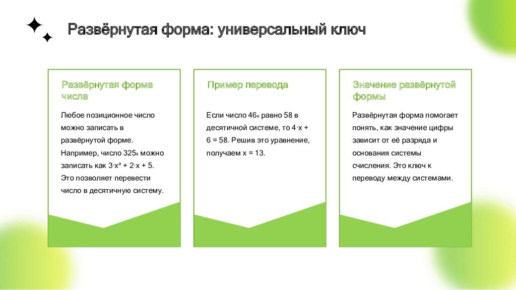 Развёрнутая форма числа Любое позиционное число можно записать в развёрнутой форме. Например, число 325ₓ можно записать как 3·x² + 2·x + 5. Это позволяет перевести число в десятичную систему. Пример перевода Если число 46ₓ равно 58 в десятичной системе, то 4·x + 6 = 58. Решив это уравнение, получаем x = 13. Значение развёрнутой формы Развёрнутая форма помогает понять, как значение цифры зависит от её разряда и основания системы счисления. Это ключ к переводу между системами. Развёрнутая форма: универсальный ключ