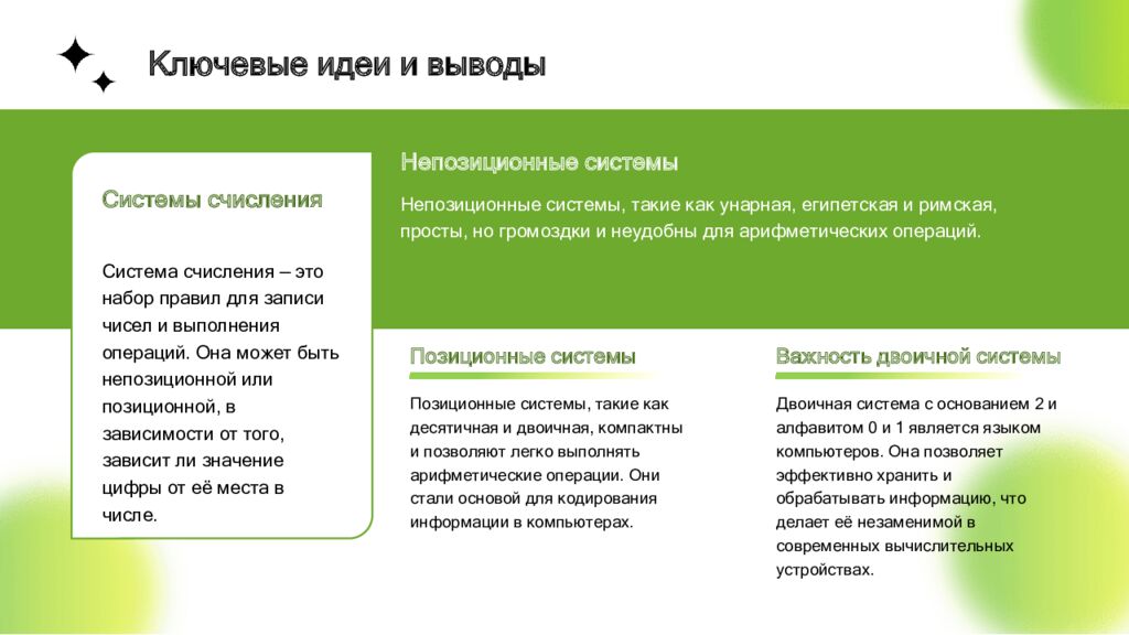 Системы счисления Система счисления — это набор правил для записи чисел и выполнения операций. Она может быть непозиционной или позиционной, в зависимости от того, зависит ли значение цифры от её места в числе. Непозиционные системы Непозиционные системы, такие как унарная, египетская и римская, просты, но громоздки и неудобны для арифметических операций. Позиционные системы Позиционные системы, такие как десятичная и двоичная, компактны и позволяют легко выполнять арифметические операции. Они стали основой для кодирования информации в компьютерах. Важность двоичной системы Двоичная система с основанием 2 и алфавитом 0 и 1 является языком компьютеров. Она позволяет эффективно хранить и обрабатывать информацию, что делает её незаменимой в современных вычислительных устройствах. Ключевые идеи и выводы