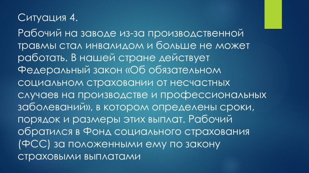 Ситуация 4. Рабочий на заводе из-за производственной травмы стал инвалидом и больше не может работать. В нашей стране действует Федеральный закон «Об обязательном социальном страховании от несчастных случаев на производстве и профессиональных заболеваний», в котором определены сроки, порядок и размеры этих выплат. Рабочий обратился в Фонд социального страхования (ФСС) за положенными ему по закону страховыми выплатами