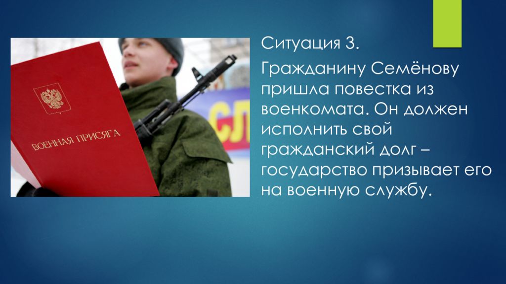 Ситуация 3. Гражданину Семёнову пришла повестка из военкомата. Он должен исполнить свой гражданский долг – государство призывает его на военную службу.