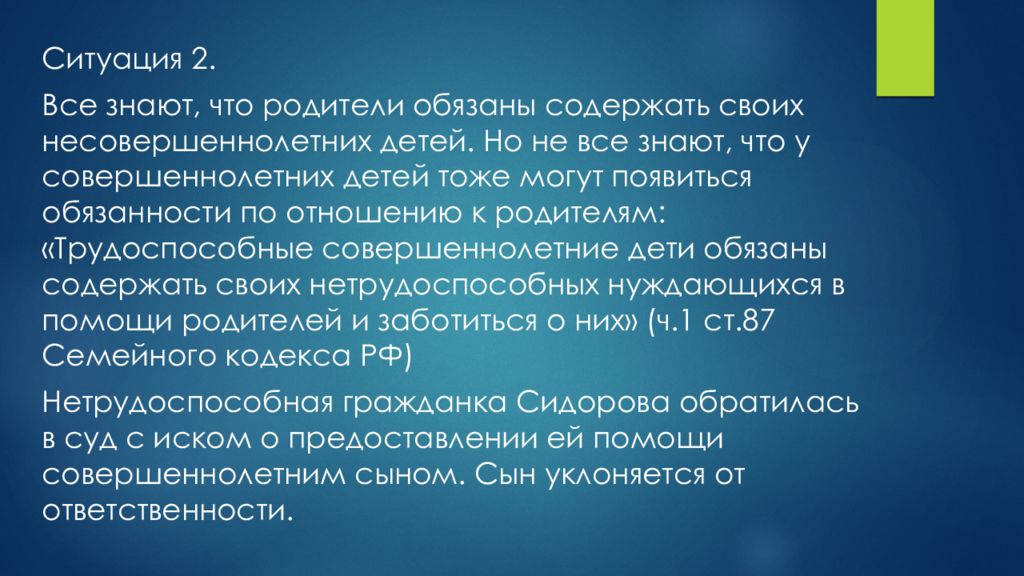 Ситуация 2. Все знают, что родители обязаны содержать своих несовершеннолетних детей. Но не все знают, что у совершеннолетних детей тоже могут появиться обязанности по отношению к родителям: «Трудоспособные совершеннолетние дети обязаны содержать своих нетрудоспособных нуждающихся в помощи родителей и заботиться о них» (ч.1 ст.87 Семейного кодекса РФ) Нетрудоспособная гражданка Сидорова обратилась в суд с иском о предоставлении ей помощи совершеннолетним сыном. Сын уклоняется от ответственности.