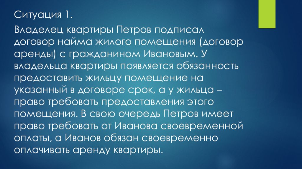 Ситуация 1. Владелец квартиры Петров подписал договор найма жилого помещения (договор аренды) с гражданином Ивановым. У владельца квартиры появляется обязанность предоставить жильцу помещение на указанный в договоре срок, а у жильца – право требовать предоставления этого помещения. В свою очередь Петров имеет право требовать от Иванова своевременной о платы, а Иванов обязан своевременно оплачивать аренду квартиры.