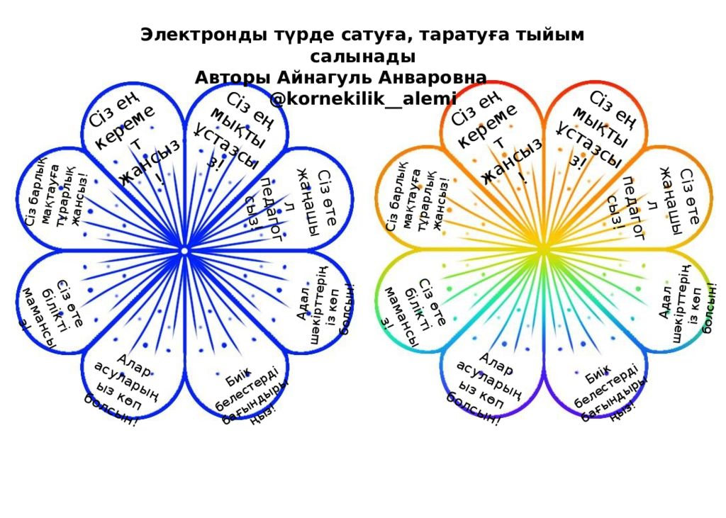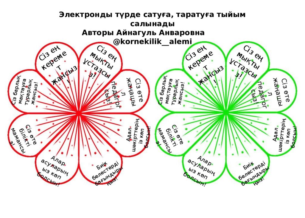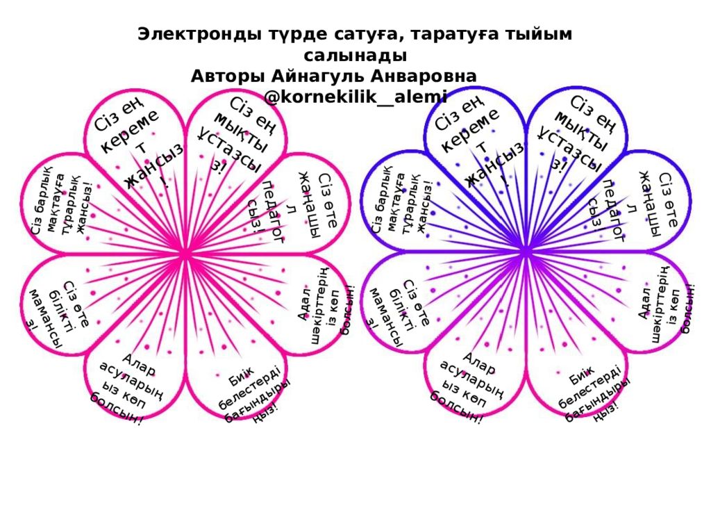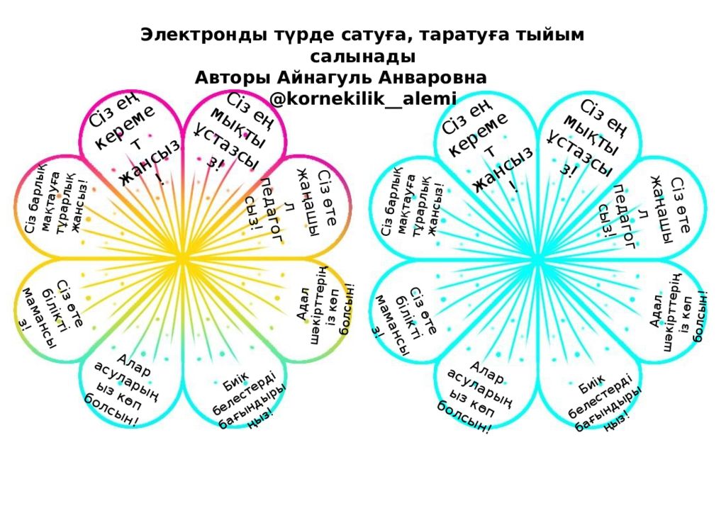 Сіз ең керемет жансыз ! Сіз ең мықты ұстазсыз ! Сіз өте жаңашыл педагогсыз ! Сіз барлық мақтауға тұрарлық жансыз ! Сіз өте білікті мамансыз ! Алар асуларыңыз көп болсын ! Адал шәкірттеріңіз көп болсын ! Биік белестерді бағындырыңыз ! Сіз ең керемет жансыз ! Сіз ең мықты ұстазсыз ! Сіз өте жаңашыл педагогсыз ! Сіз барлық мақтауға тұрарлық жансыз ! Сіз өте білікті мамансыз ! Алар асуларыңыз көп болсын ! Адал шәкірттеріңіз көп болсын ! Биік белестерді бағындырыңыз ! Электронды түрде сатуға, таратуға тыйым салынады Авторы Айнагуль Анваровна @ kornekilik __ alemi