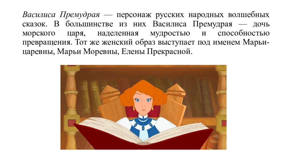 Василиса Премудрая — персонаж русских народных волшебных сказок. В большинстве из них Василиса Премудрая — дочь морского царя, наделенная мудростью и способностью превращения. Тот же женский образ выступает под именем Марьи-царевны, Марьи Моревны, Елены Прекрасной.
